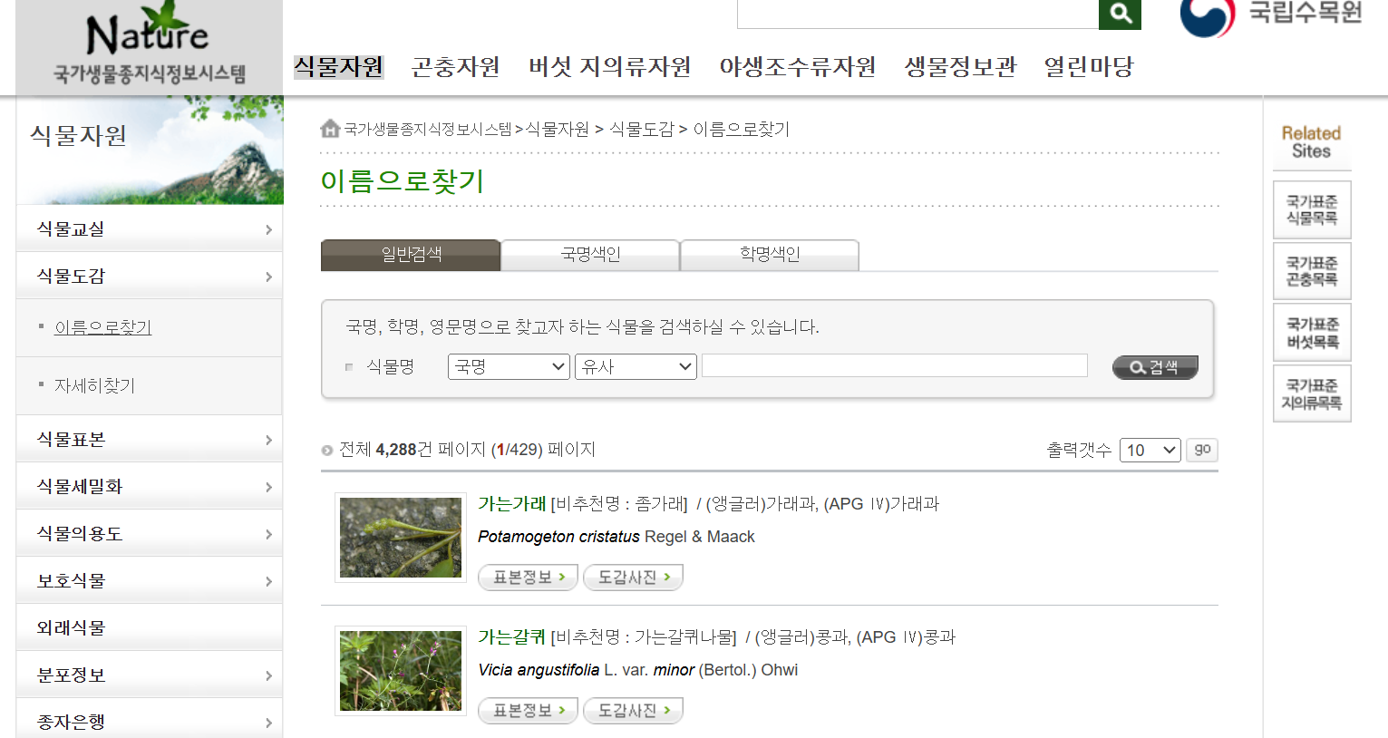국가생물종지식정보시스템 > 식물자원 > 식물도감 > 이름으로 찾기