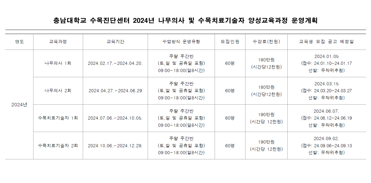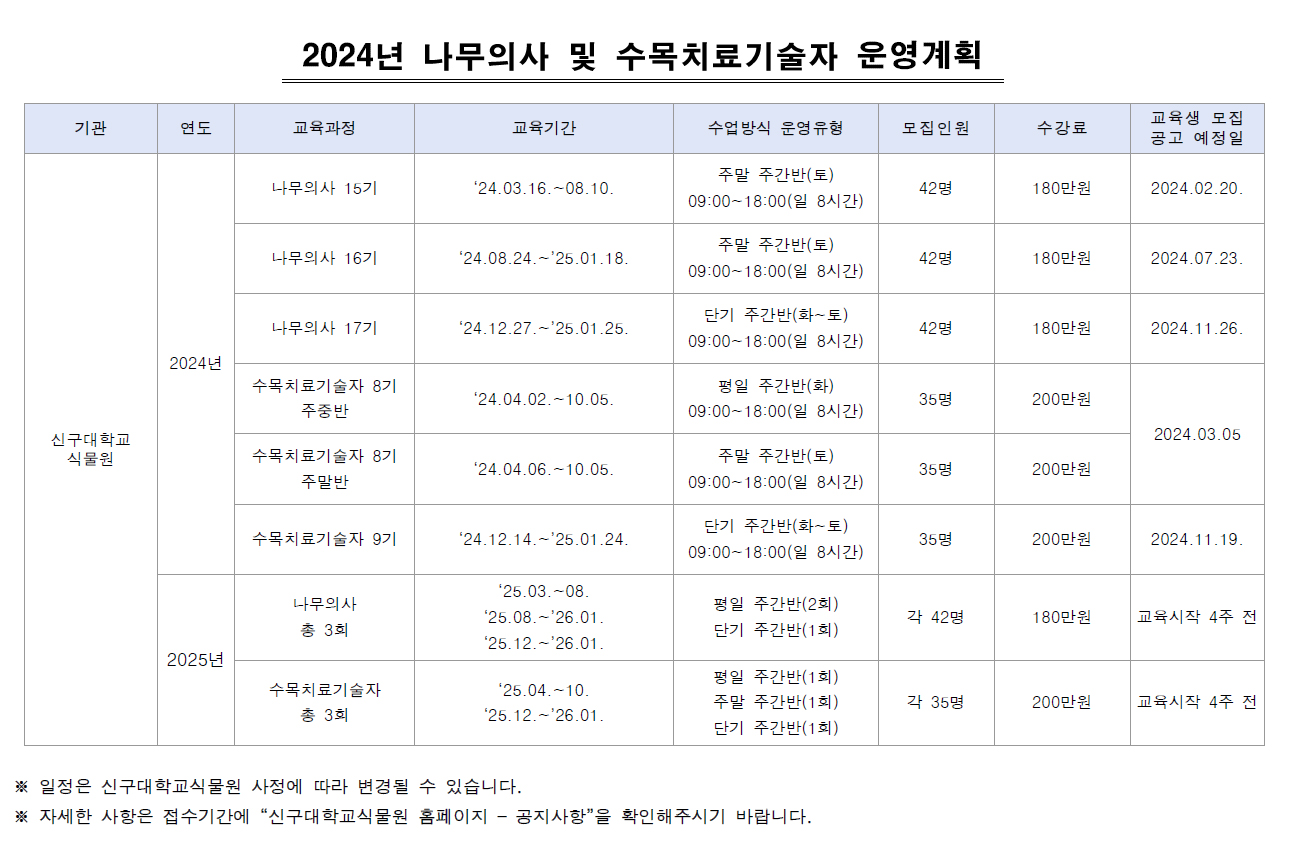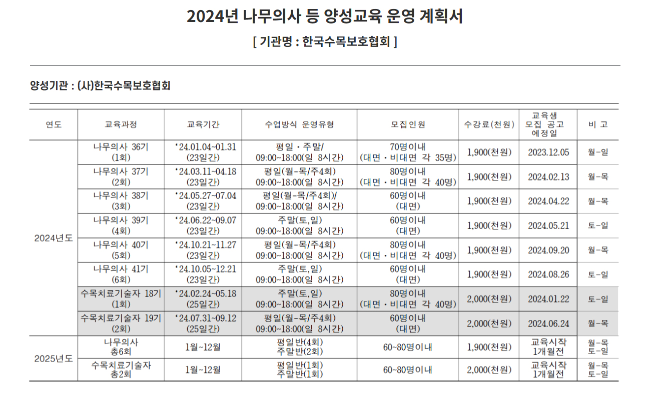 2024년도 서울대학교 식물병원 양성교육과정 운영계획 나무의사 및 수목치료기술자 공지사항 – 바로가기 2024년도 나무의사 자격시험 시행계획 및 출제범위 나무의사 – 공지사항 – 바로가기