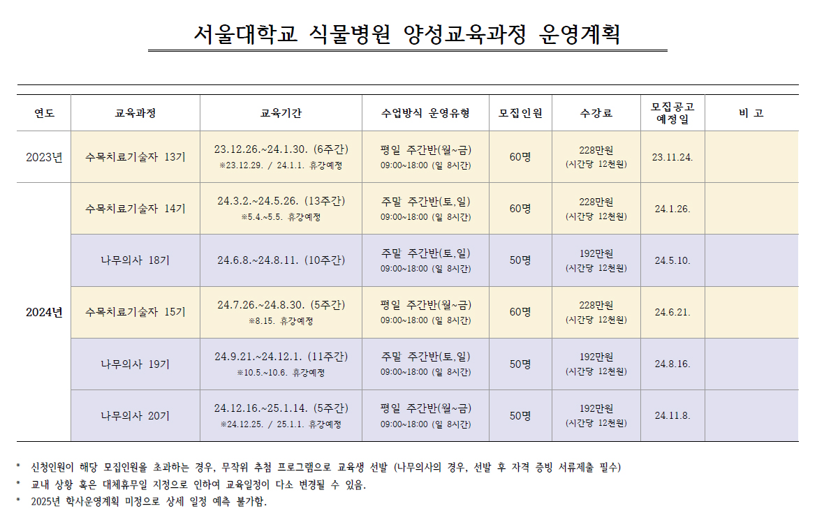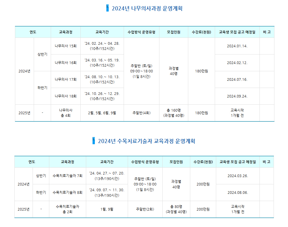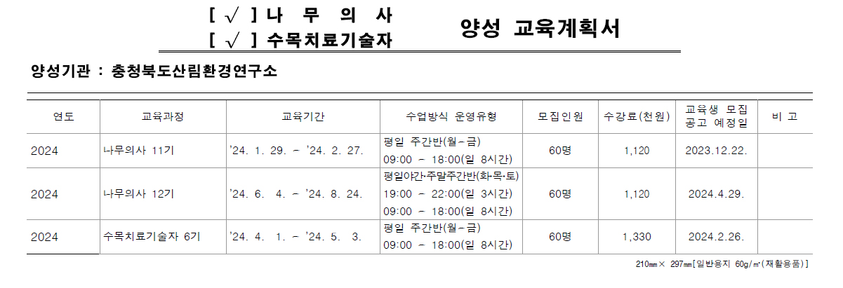 2024년도 서울대학교 식물병원 양성교육과정 운영계획 나무의사 및 수목치료기술자 공지사항 – 바로가기 2024년도 나무의사 자격시험 시행계획 및 출제범위 나무의사 – 공지사항 – 바로가기