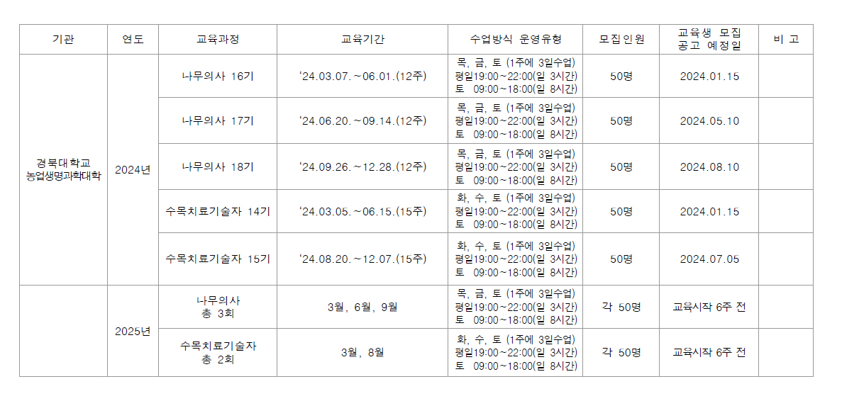 경북대학교 경북대학교 농업생명과학대학 <em>나무의사 및 수목치료기술자양성과정</em> 홈페이지 입니다.