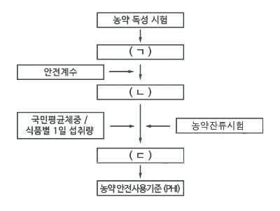 118. 농약 안전사용기준 설정 과정의 모식도이다. ( ) 안에 들어갈 용어로 옳게 연결된 것은?