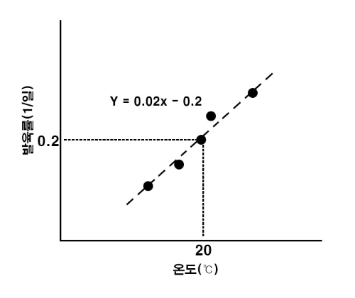 - r(T) : 발육률(1/발육기간), a : 직선회귀식의 기울기, T : 온도, b : 0℃에서의 발육률