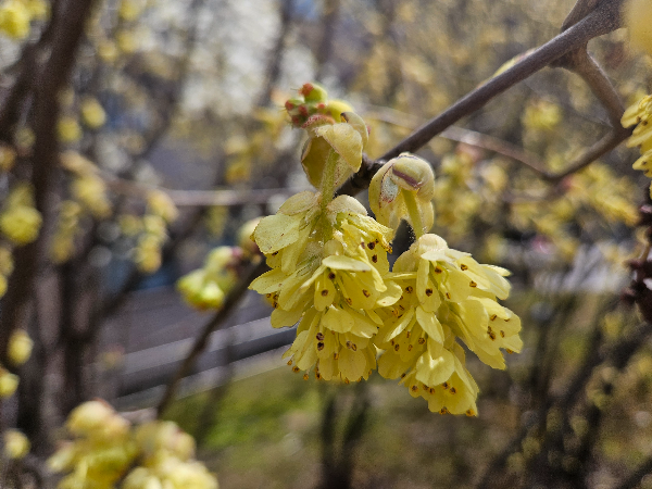 * 3월 말~4월 중 밝은 노란색으로 잎보다 먼저 피고 8~12개의 꽃이 총상꽃차례로 달려 늘어진다.