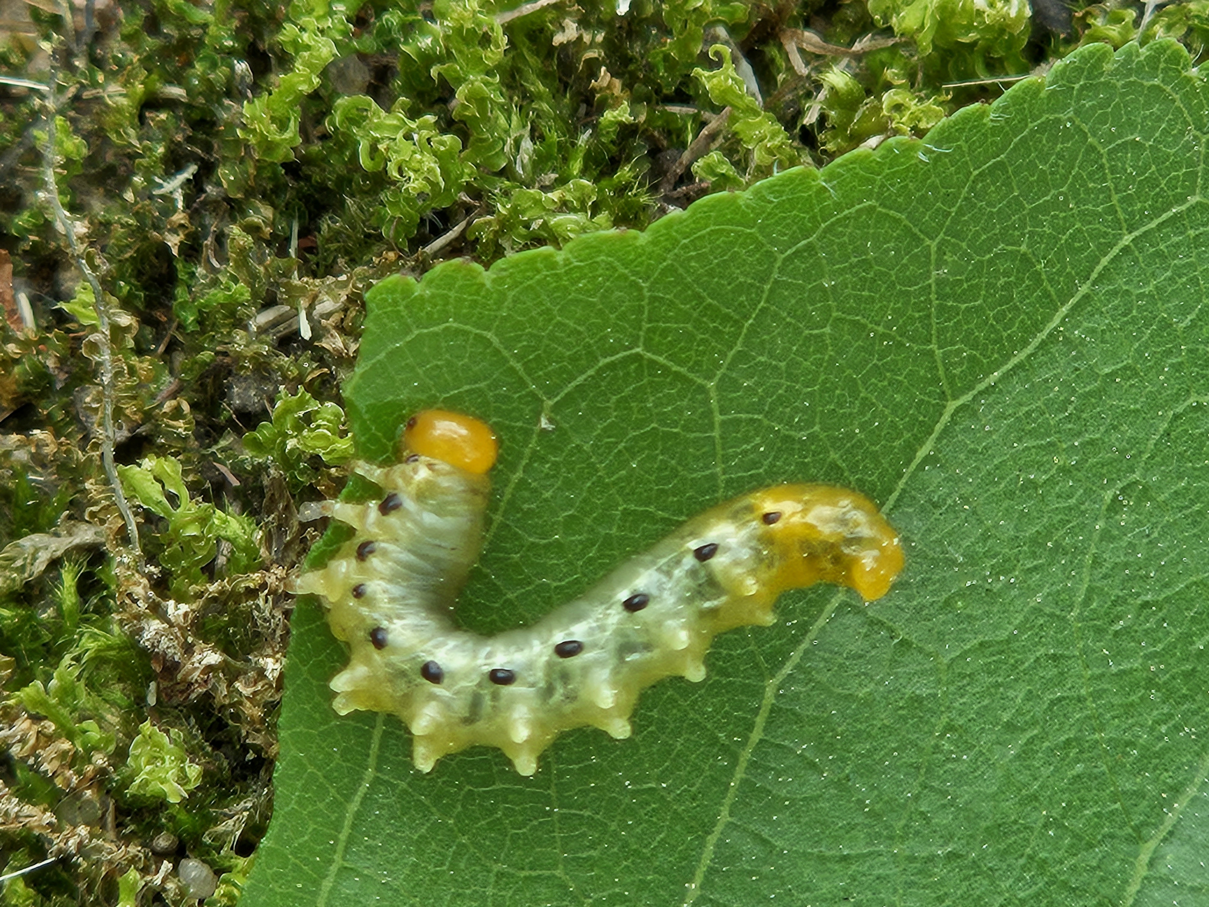 유충의 체색은 연녹색에 회색 기운이 약간 있으며 머리와 배 끝은 황색을 띤다. 유충의 기문을 따라 측면에 둥근 검은 점이 있다. 자극을 주면 몸을 둥글게 말고 배 끝을 쳐든다.다자란 유충의 크기는 약 30mm 정도고 번데기는 기주식물 잎 또는 작은 가지 사이에 엉성한 고치를 만들고는 그 속에서 번데기가 된다. 성충의 몸은 검은색이고 크기는 약 12~15mm 정도다. 알은 유백색이며 크기는 2mm 정도고 타원형이다.