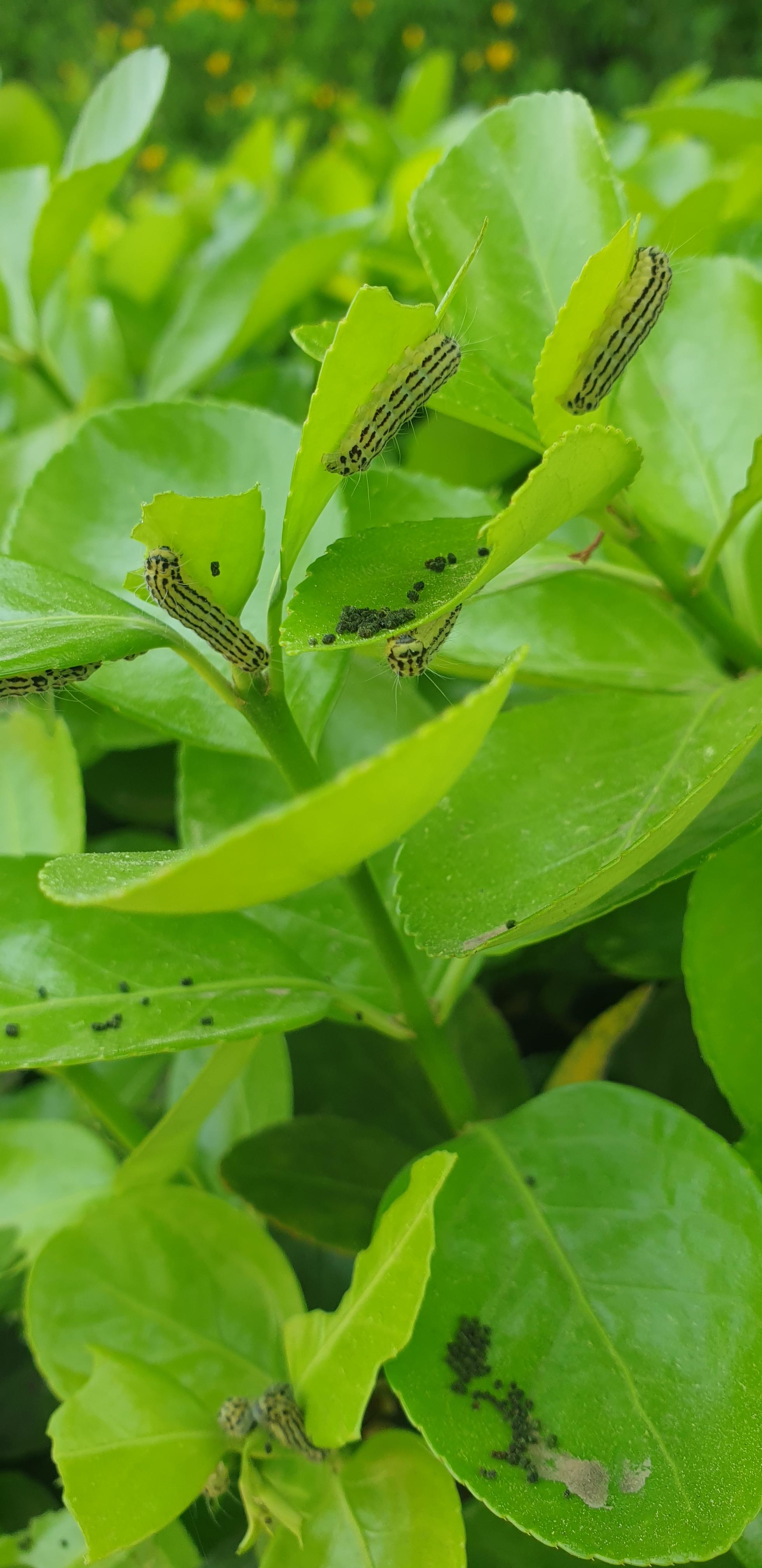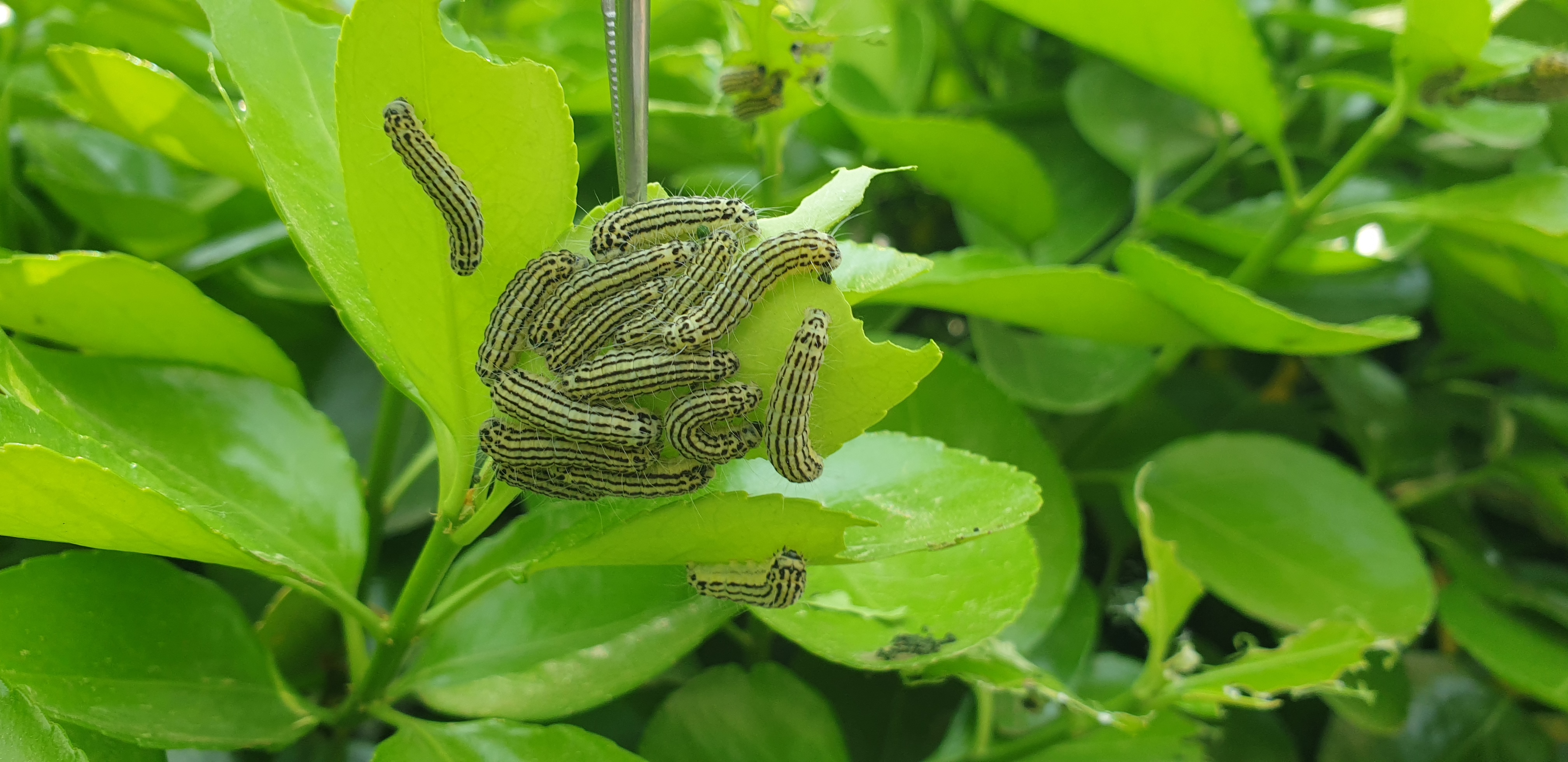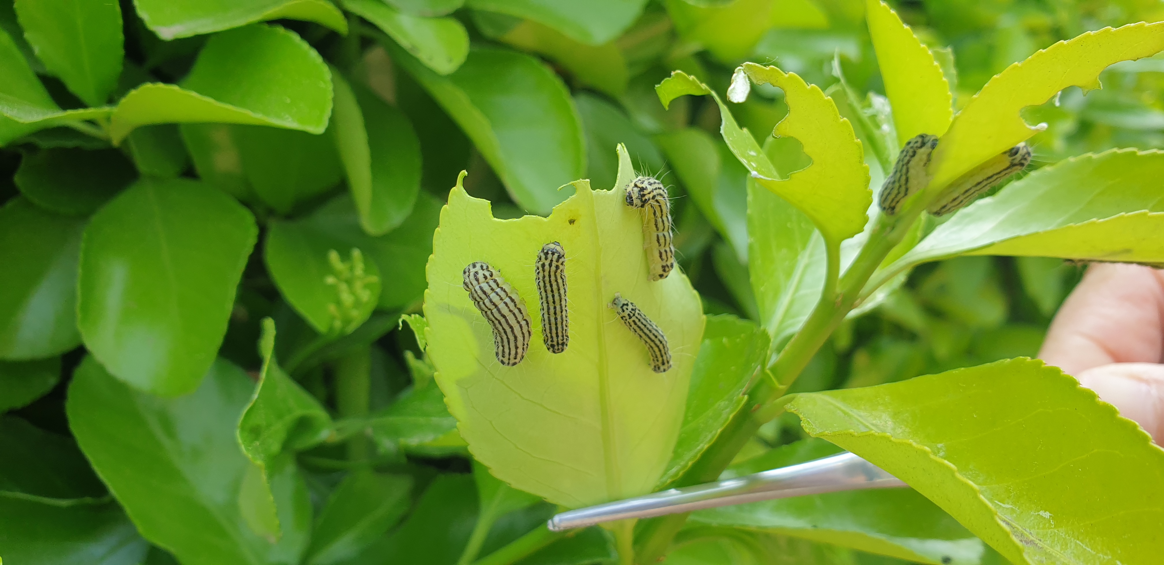 대발생하여 가지만을 남기고 잎 전체를 식해 하므로 수벽으로 조성된 사철나무 벽이 엉성해진다.