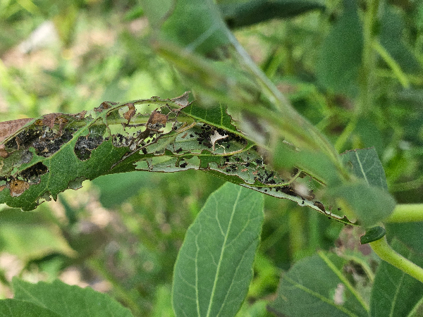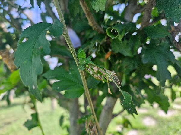 * 무궁화를 가해하는 최대 해충의 하나로 유충이 잎을 둥글게 말고 그 속에서 거미줄을 치고 잎을 가해하는데, 어린 유충은 잎맥을 따라 잎을 가해하지만 노숙유충이 되면 잎맥도 남기지 않고 잎 전체를 가해한다.