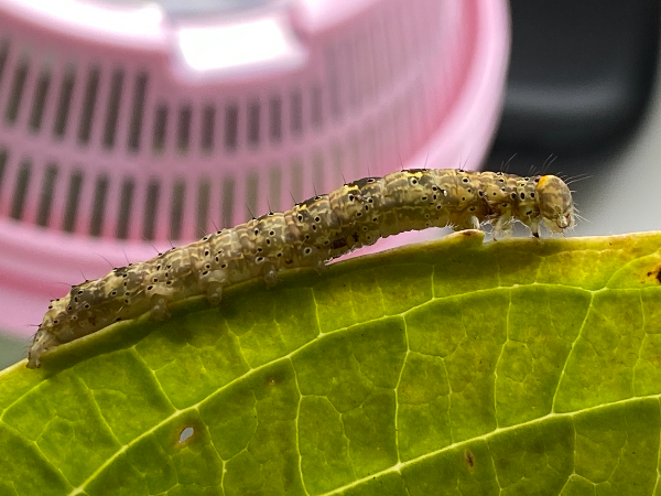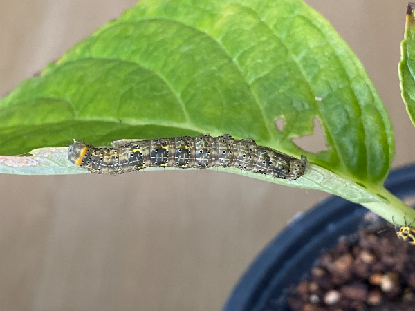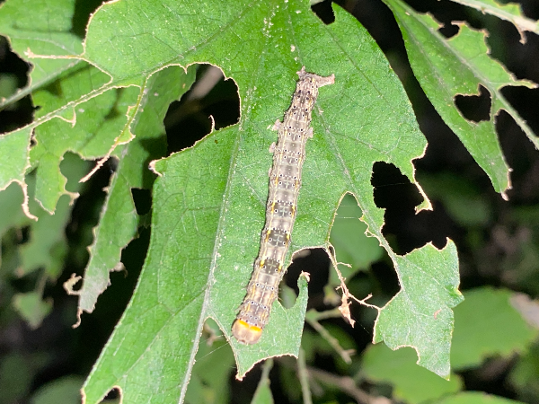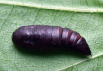 * 유충은 어릴 때는 녹색이고 양 옆으로 가는 노란색 줄과 작은 점이 있으나 자라면서 회갈색으로 변해 나뭇가지처럼 보인다.